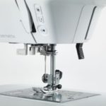 When you change from a single to a double needle, the “double needle button” will help you adapt your needle to the presser foot so that neither needle will inadvertently hit the presser foot and break off. The “double needle safety” function limits the stitch width so that the needle doesn’t hit the presser foot.