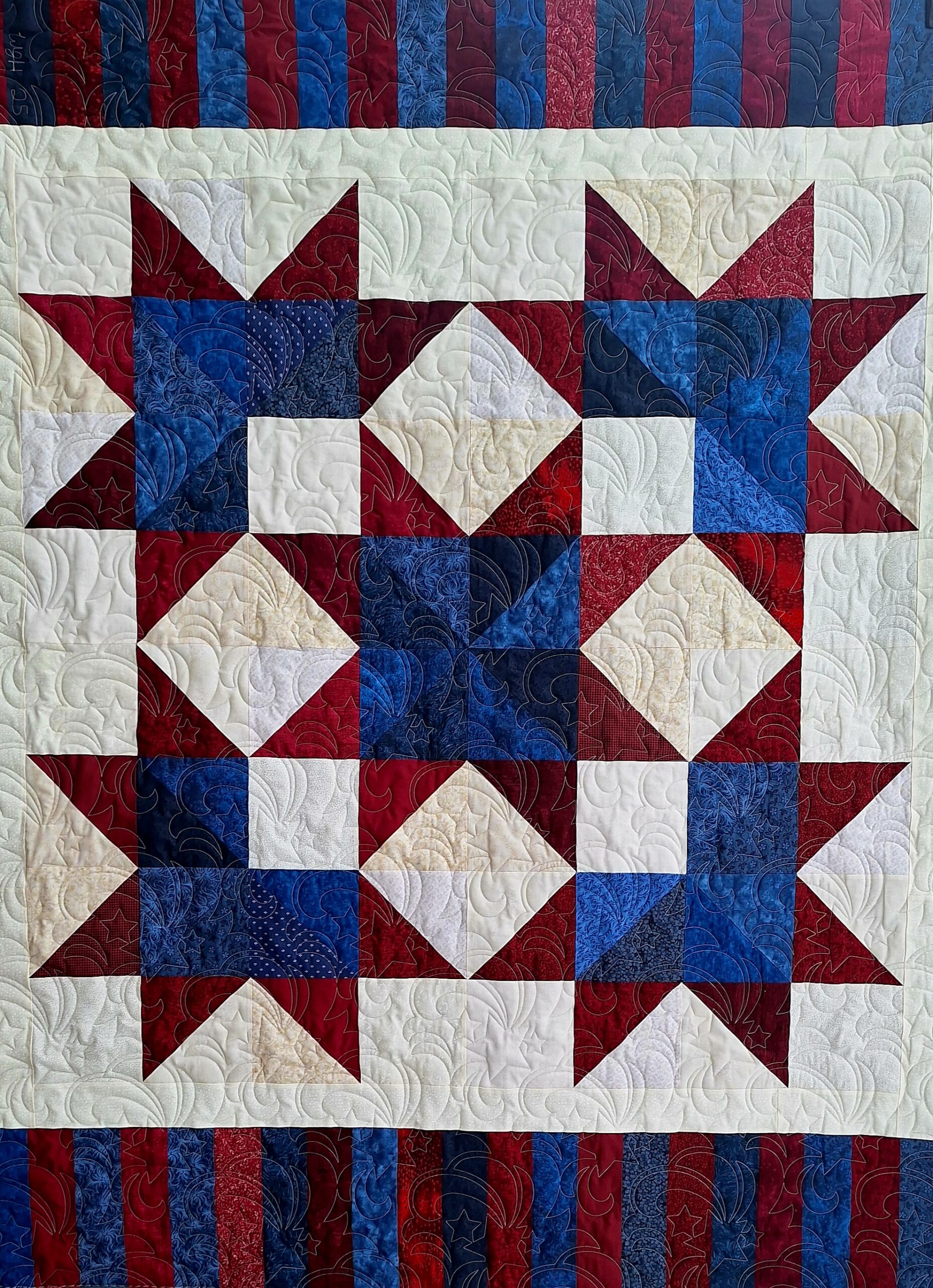 Happy 250th Birthday USA! This quilt is a great project for beginners and a quick and easy project for the seasoned quilter. You’ll learn some tips about putting together half square triangles, matching seams and points and fixing mistakes (if you make them). You may choose Red, White and Blue or select your own color palette with a Layer Cake. Come and build some confidence with Bill as your instructor.